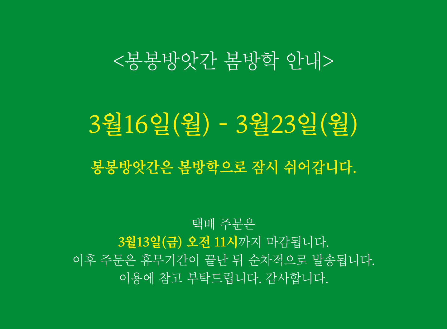 ![]() 상호명 | 봉봉방앗간 대표 | 김남기 사업자번호 | 226-11-44853 통신판매업신고 | 2018-강원강릉-0002호 주소 | 강원도 강릉시 경강로 2024번길 17-1 (명주동 28-2) 대표번호 | 033-647-1711 개인정보책임자 | 김남기 E-MAIL | sswd1004@naver.com | CS CENTER 033 - 647 -1711 일, 월 | 정기휴무 (매주) 화 - 토 | 11:00 - 18:00 ※ 추가 휴무일은 별도 공지참조 | BANK ACCOUNT 200063-02-008899 우체국 예금주 | 봉봉방앗간(김남기) |